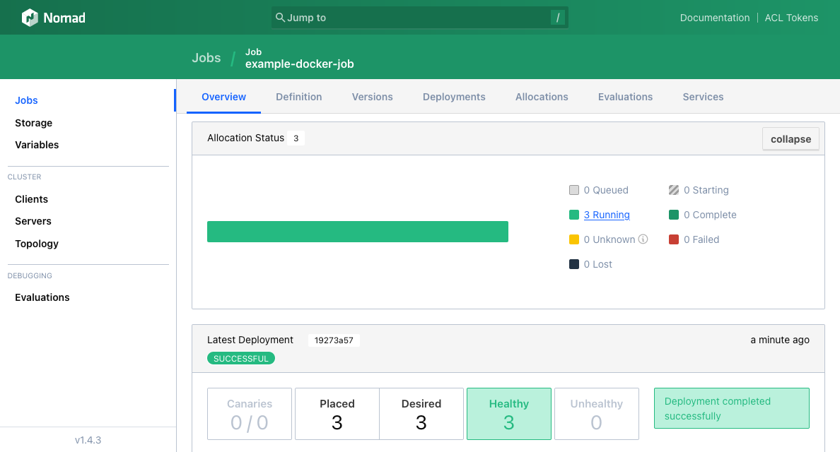 Open the Nomad web interface from one of the server nodes, as described in the previous section.